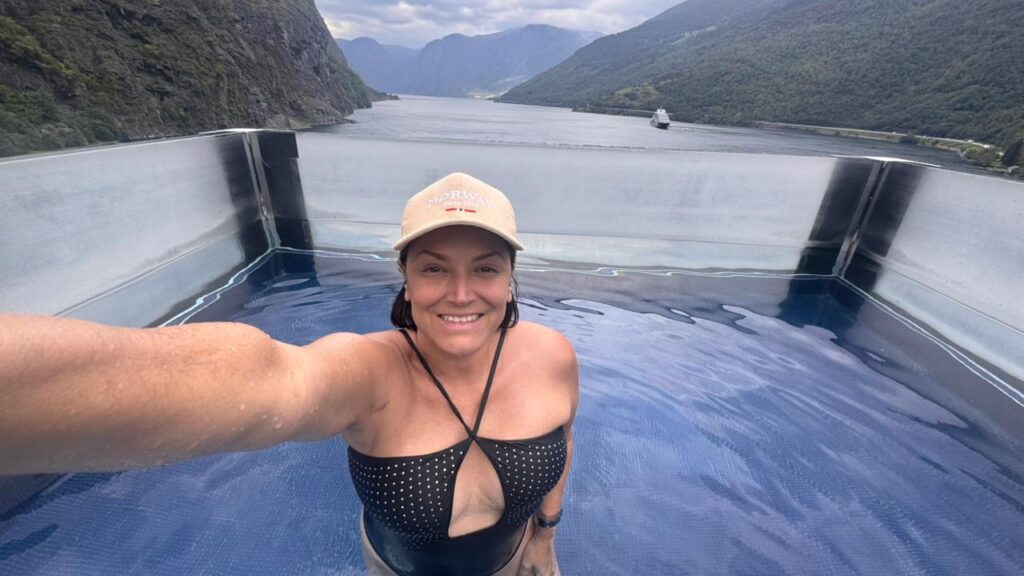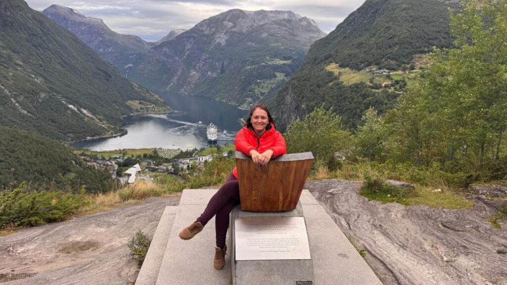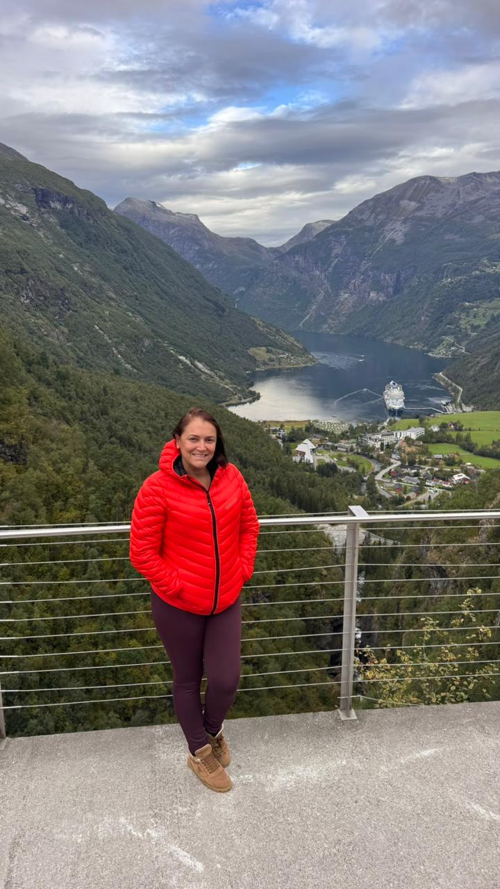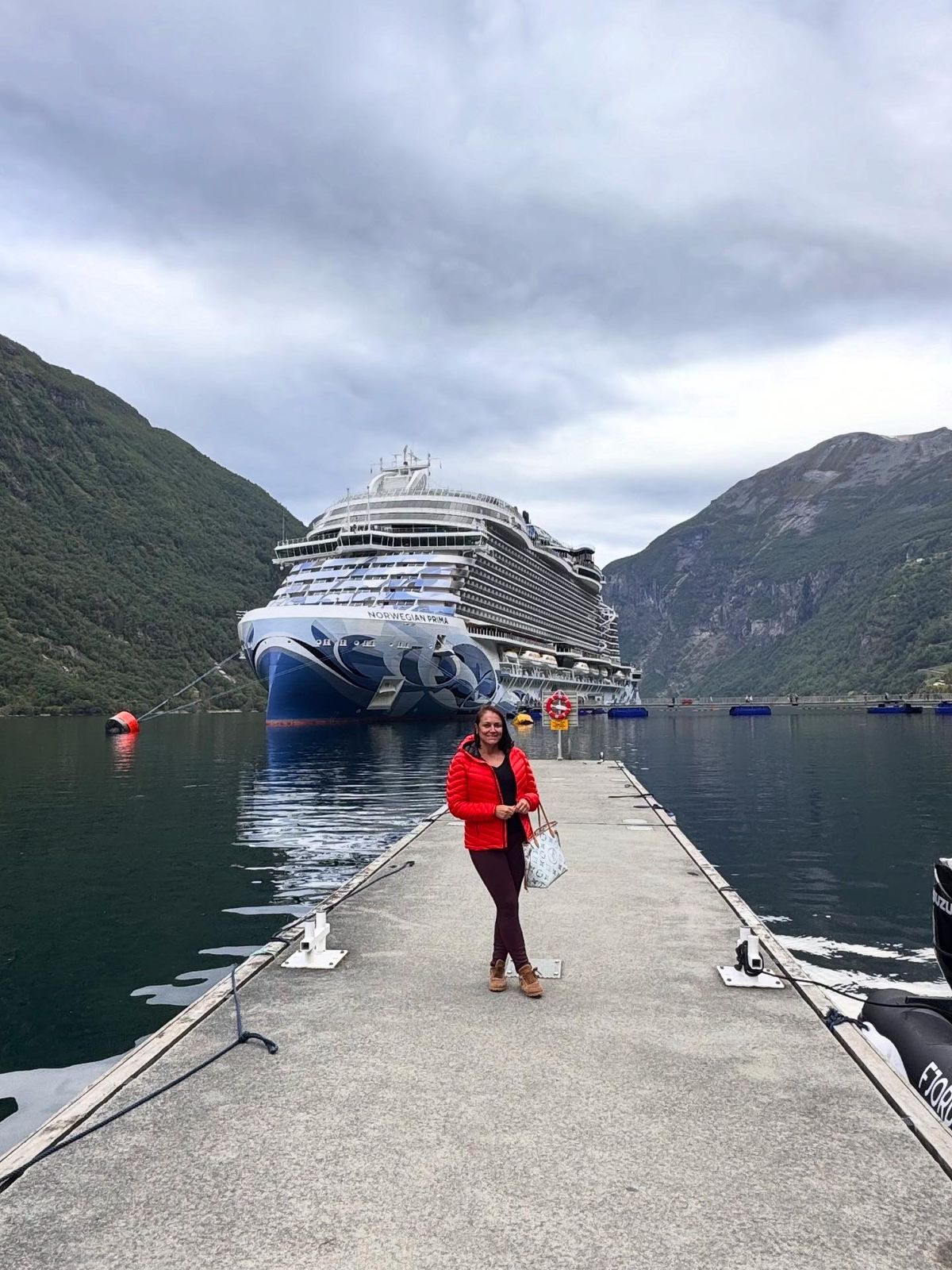 Nossa última parada na Noruega foi Ålesund. A expectativa era grande e confesso que, quando o navio começou a se aproximar da cidade, fiquei completamente encantada. As casinhas coloridas refletindo nas águas, as montanhas que parecem abraçar a cidade e o céu nublado, com aquele ar misterioso típico da Escandinávia, criavam um verdadeiro cenário de filme.