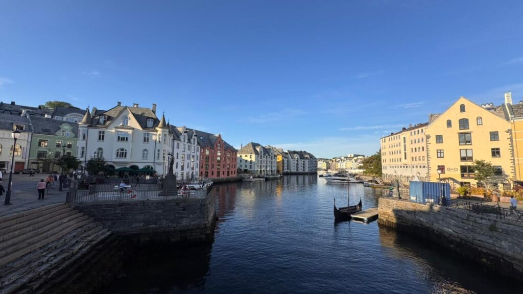 Depois, descemos sem pressa, aproveitando cada cantinho de Ålesund. Caminhar pela cidade é um convite a observar os detalhes: fachadas bem preservadas, ruas tranquilas, canais que lembram pequenas cidades costeiras europeias e um ritmo de vida sereno, que combina perfeitamente com a paisagem ao redor.