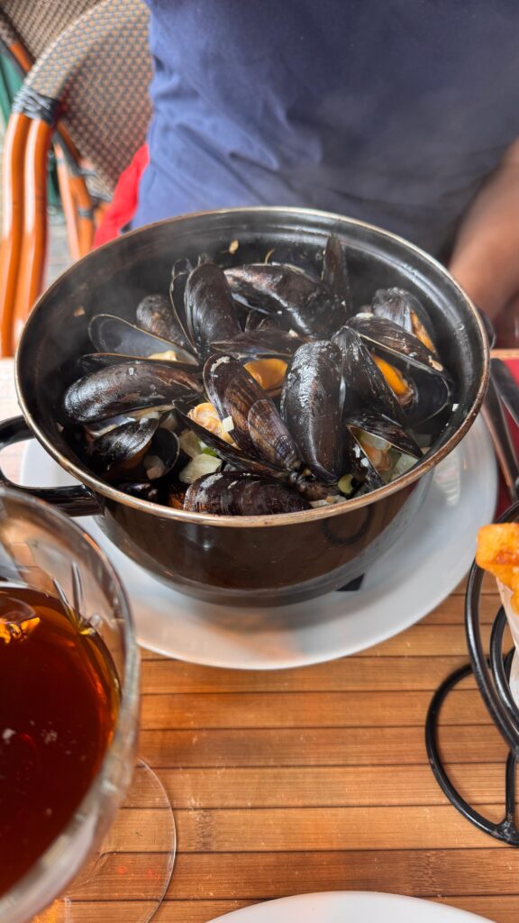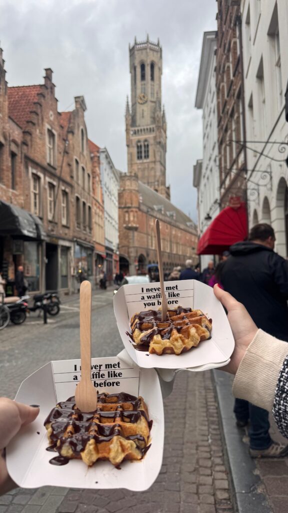 Nenhuma visita a Bruges está completa sem provar seus famosos waffles belgas. Você encontra versões simples, com açúcar ou chocolate, e outras mais elaboradas, com frutas, chantilly e sorvetes. Outra parada obrigatória são as chocolaterias artesanais, que fazem parte da identidade da cidade — vale experimentar os pralinés e levar alguns como lembrança.