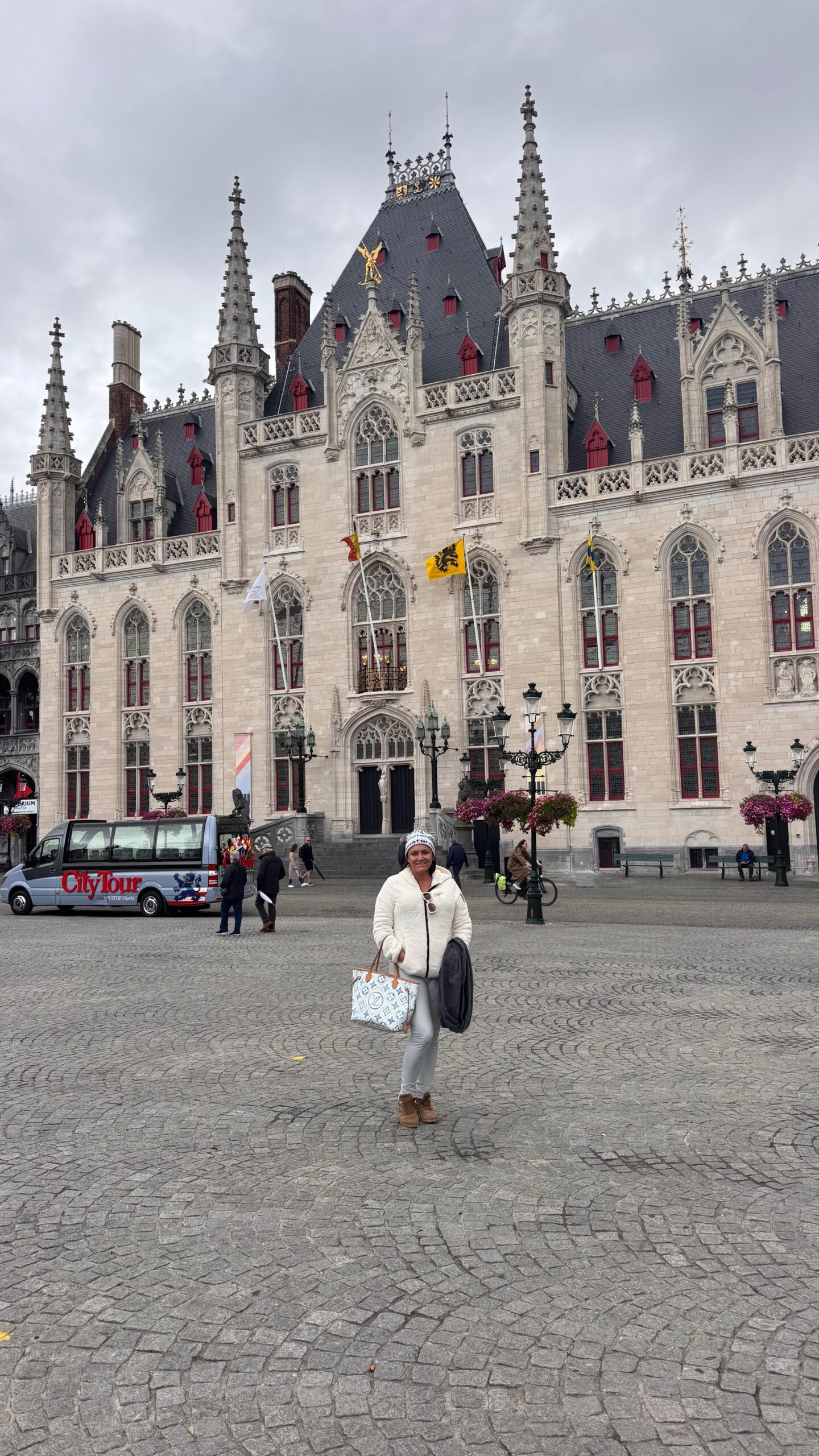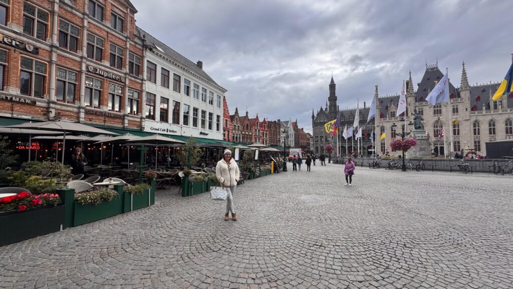 Nossa visita a Bruges foi uma parada de navio, o que não impediu de aproveitarmos bem a cidade. Começamos o dia na praça central e coração da cidade. É ali que está o imponente Belfort de Bruges, a torre do sino com mais de 80 metros de altura. Para quem tem disposição, vale subir os degraus e admirar uma das vistas mais bonitas da cidade, com os telhados medievais se estendendo até onde a vista alcança. Ao redor da praça, o ideal é caminhar sem pressa, observar o movimento e garantir as fotos clássicas de Bruges.