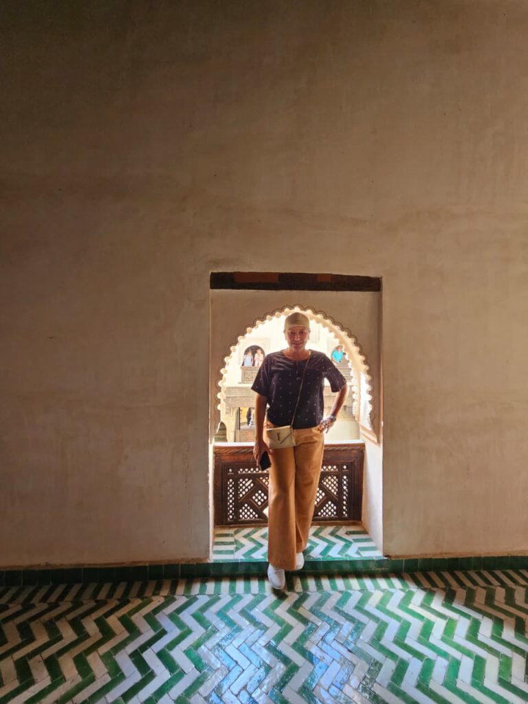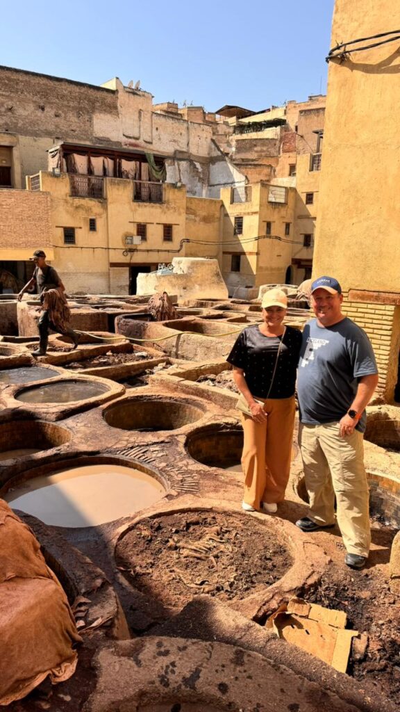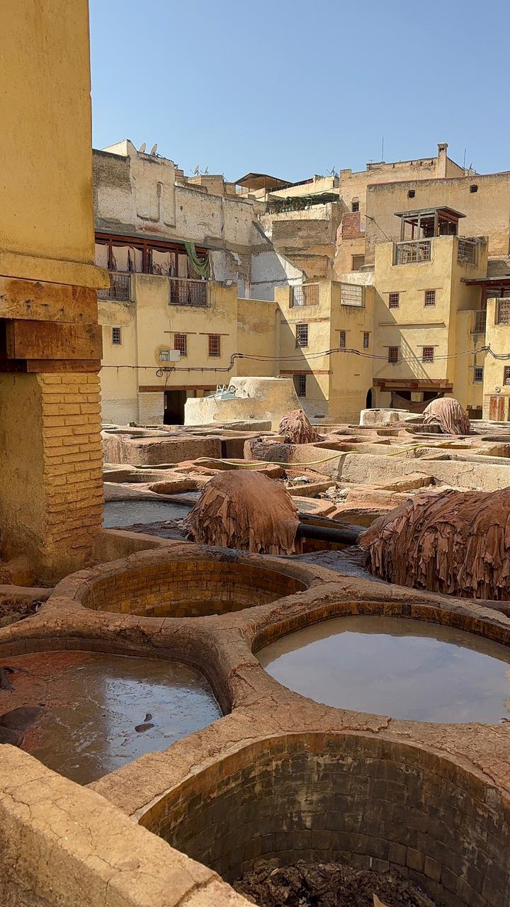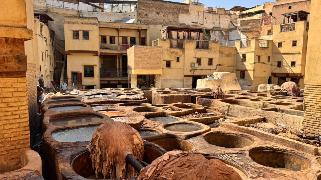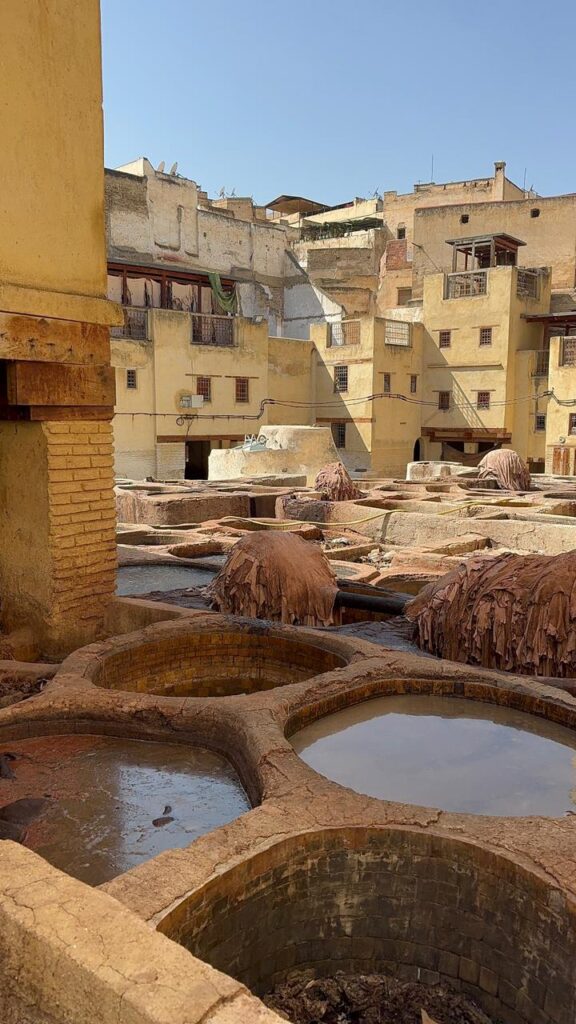 Visitamos as famosas tinturarias de couro de Chouara, um dos lugares mais emblemáticos da cidade e que ficou ainda mais conhecido entre os brasileiros por ter aparecido na novela O Clone. Lá, o couro ainda é tratado e tingido segundo técnicas ancestrais, com tanques coloridos que formam uma das imagens mais icônicas e fotografadas do Marrocos.