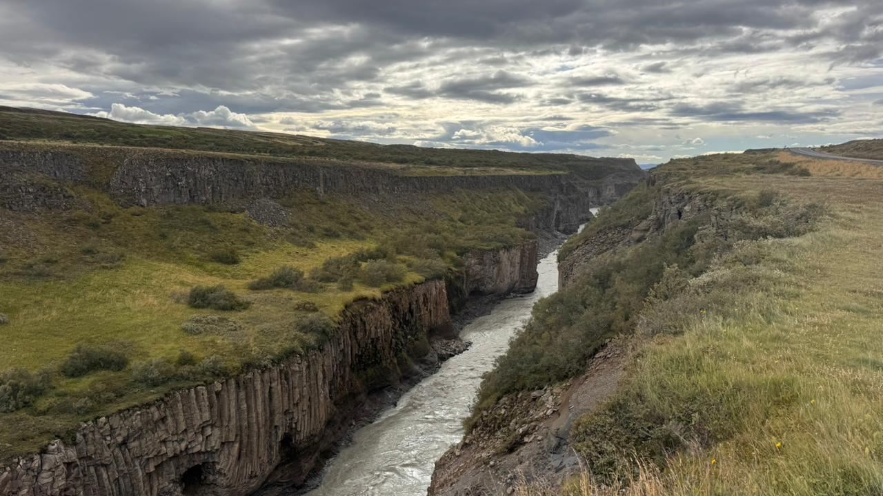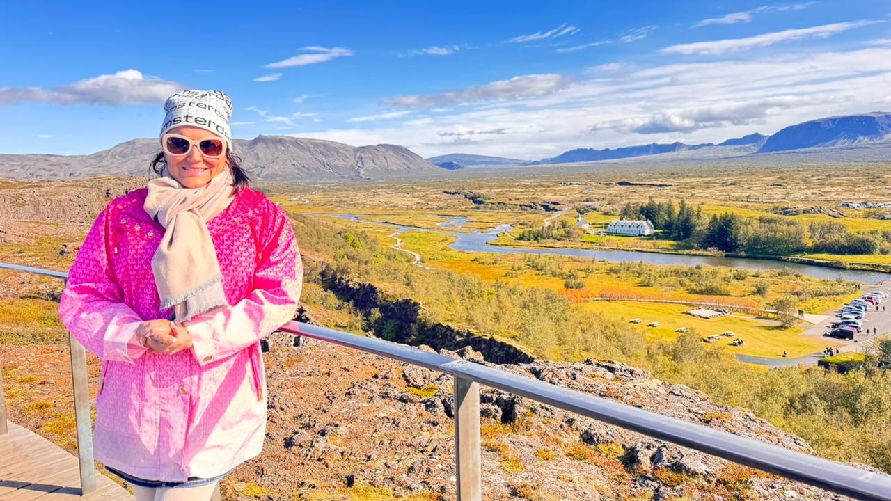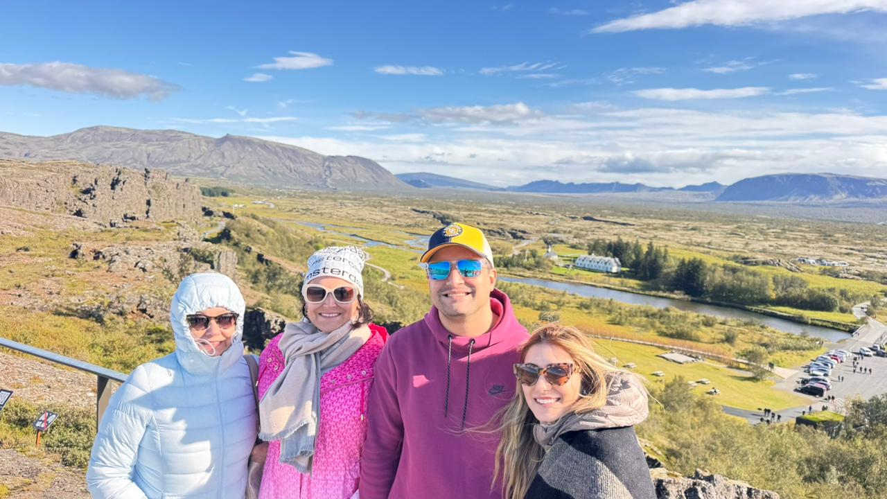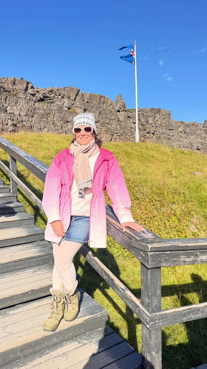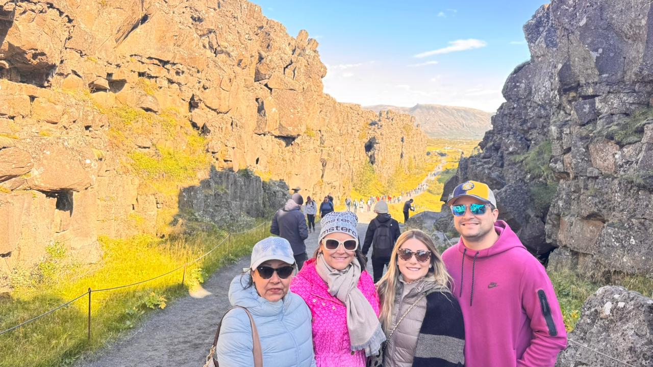 Começamos pelo Parque Nacional Þingvellir (Thingvellir), um lugar de importância histórica e geológica. Foi ali que se formou o primeiro parlamento islandês, no ano 930, e também onde é possível observar o encontro das placas tectônicas da América do Norte e da Eurásia, que se separam lentamente, criando fendas e desfiladeiros impressionantes.