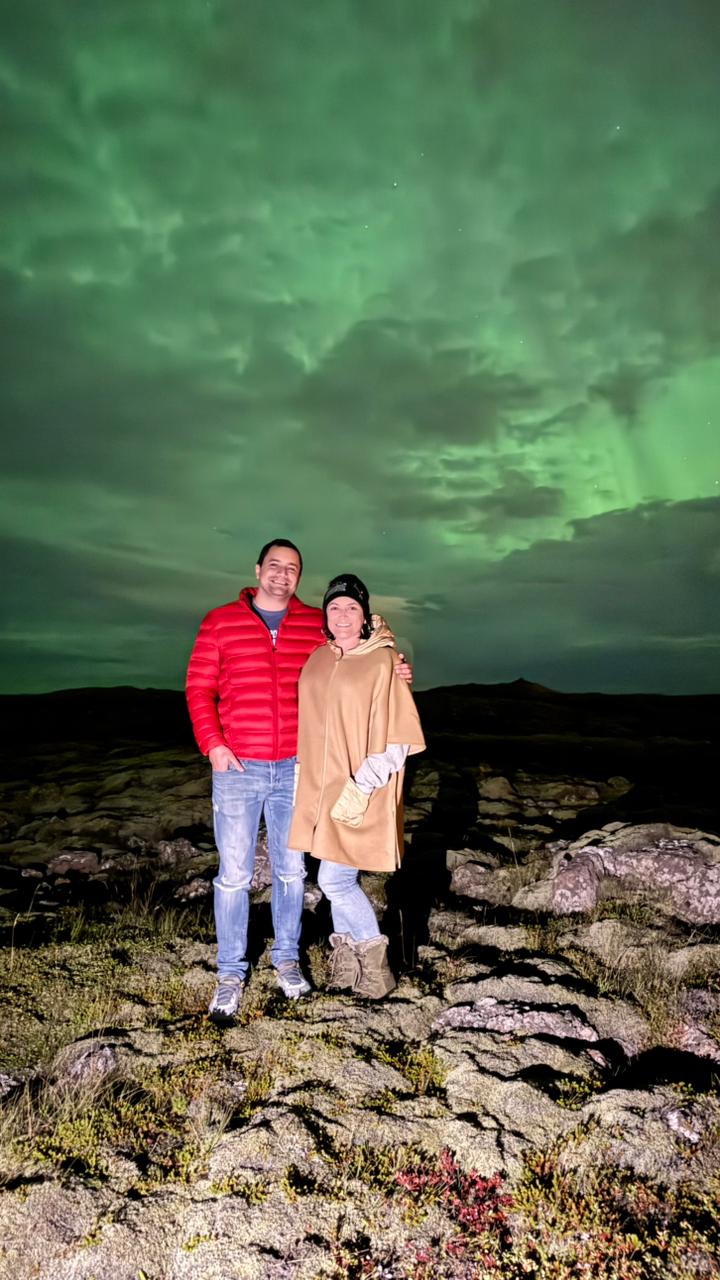 Vivemos uma incrível surpesa na nossa primeira noite na Islândia. Mal sabíamos que o melhor da viagem seria logo na primeira noite. Conseguimos ver a aurora boreal logo no início de setembro! Foi um espetáculo inesquecível, as luzes dançavam no céu em tons de verde e roxo, visíveis de vários pontos próximos à cidade. Nosso guia nos levou a locais com maior visibilidade, e a experiência foi simplesmente mágica.