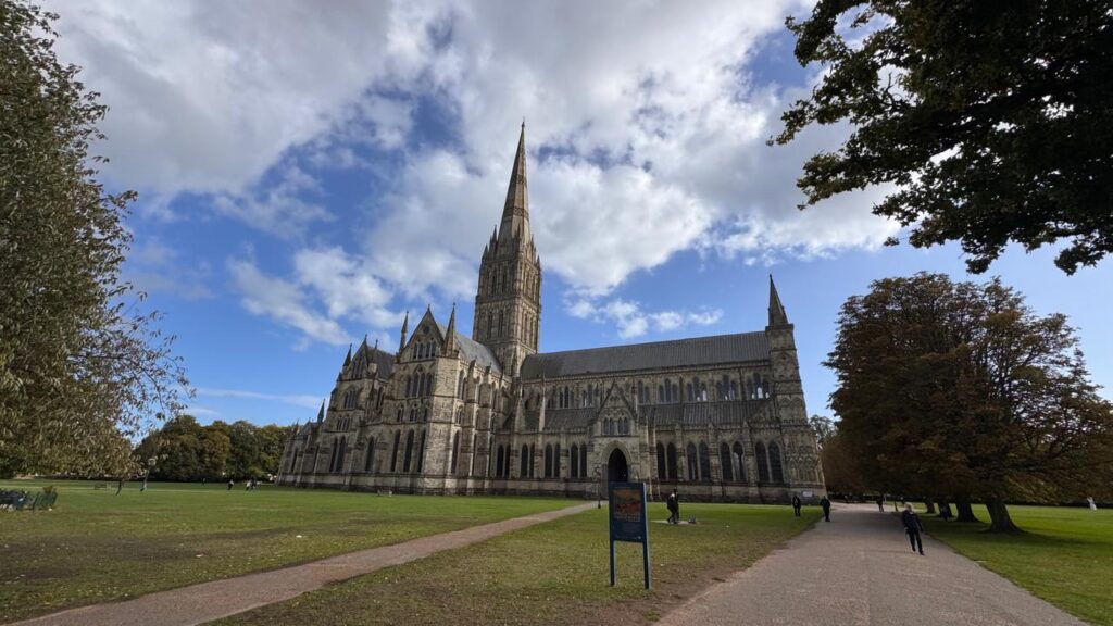 Depois de absorver a energia de Stonehenge, seguimos para Salisbury, que trouxe um contraste perfeito ao passeio. A cidade é charmosa, organizada e tranquila, com um centro histórico delicioso para caminhar. A Salisbury Cathedral impressiona logo de longe com sua torre imponente, a mais alta da Inglaterra. Por dentro, além da beleza da arquitetura gótica, é emocionante saber que ali está preservada uma das cópias originais da Magna Carta, um dos documentos mais importantes da história. Passear pelas ruas antigas, observar as construções e sentir o ritmo calmo da cidade foi a forma ideal de encerrar o dia, equilibrando o mistério de Stonehenge com a elegância e a história de Salisbury.